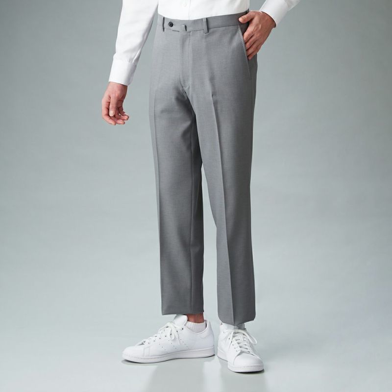 ビジネスシーンに大活躍する裾上げ済みの無地ノータックスラックス。スタイリッシュでスリムなシルエットです。