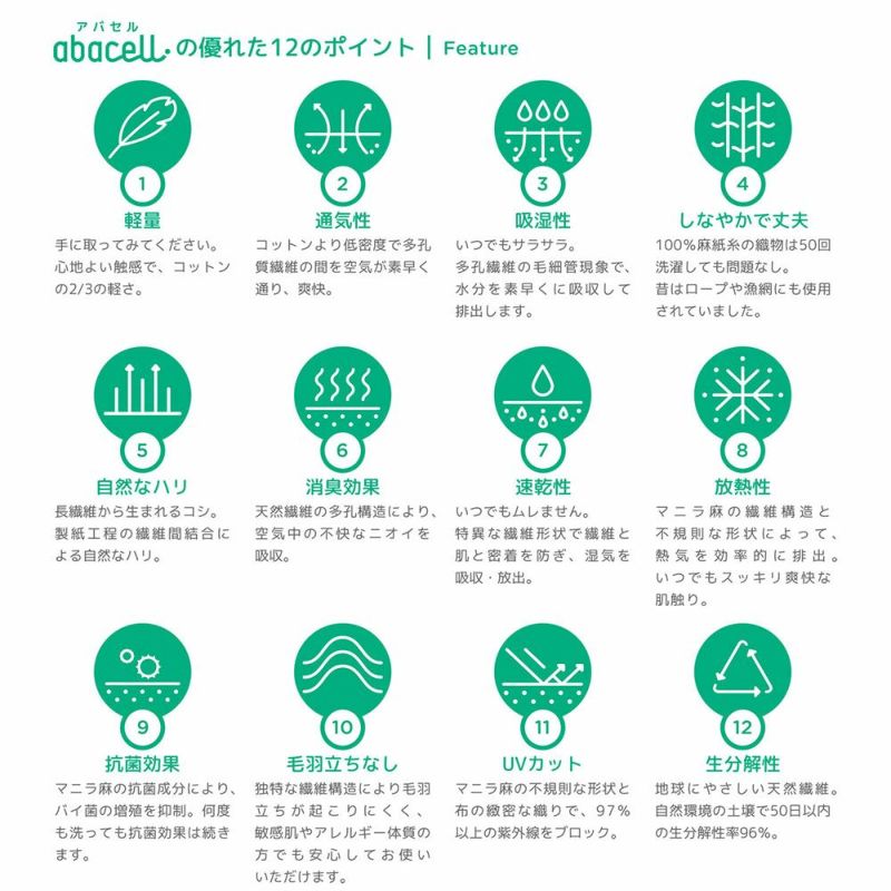 ペーパーヤーン=「abacell(アバセル)」は、高級和紙に使われる麻紙糸で、麻のような清涼感のある素材です。綿やポリエステルコットンの鹿の子と比べても軽量でシャリシャリとしたドライタッチが特徴です。