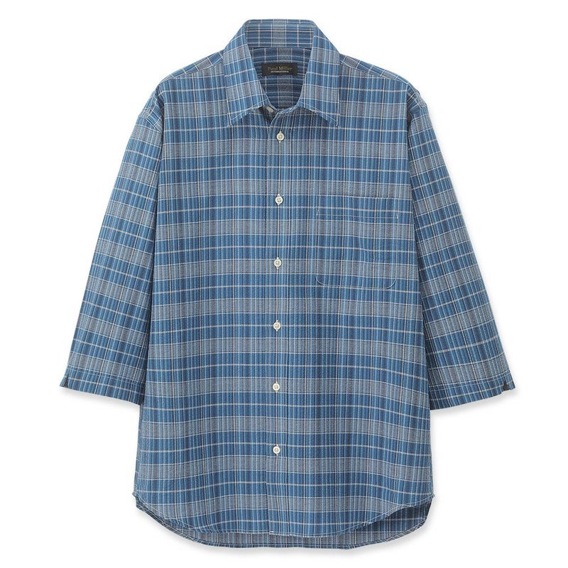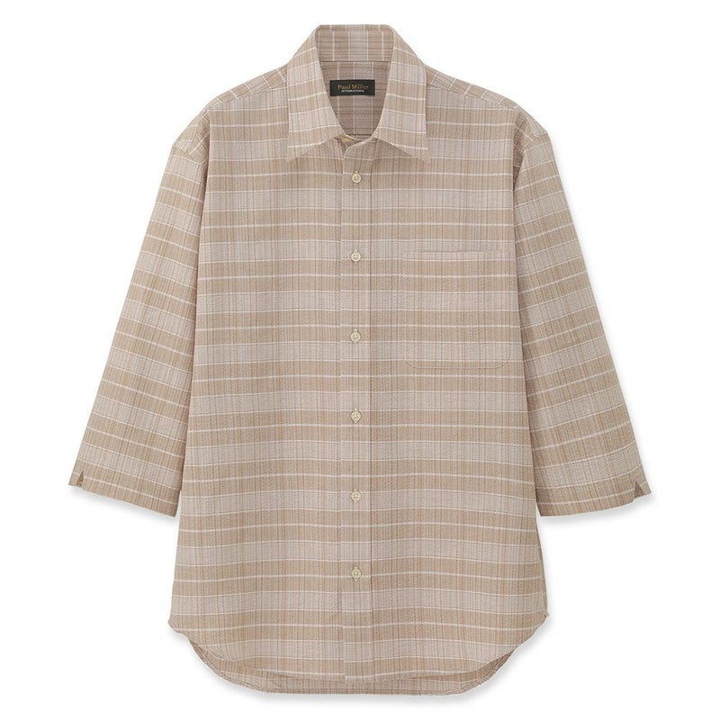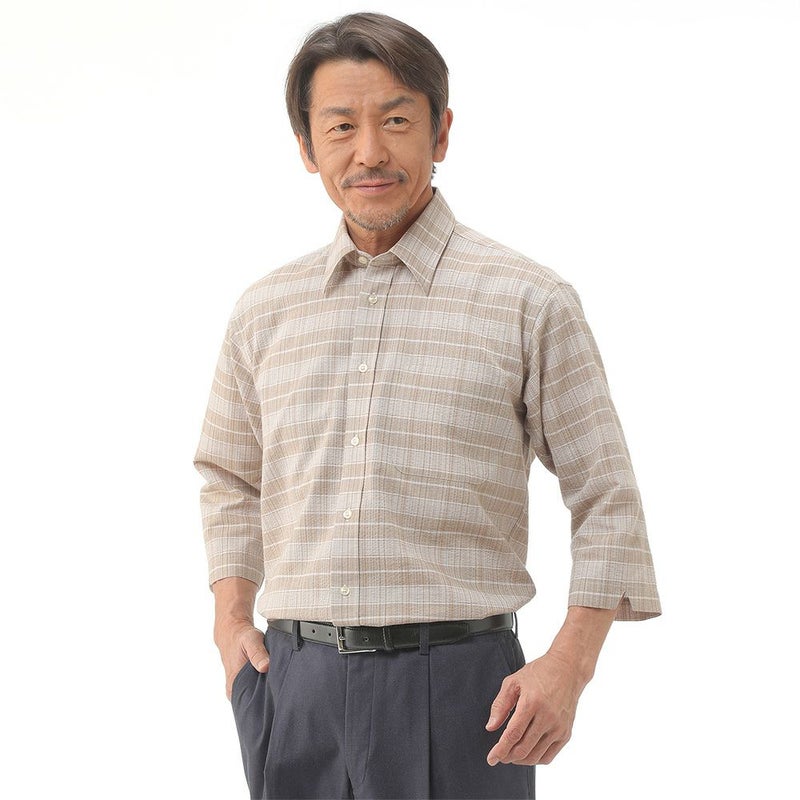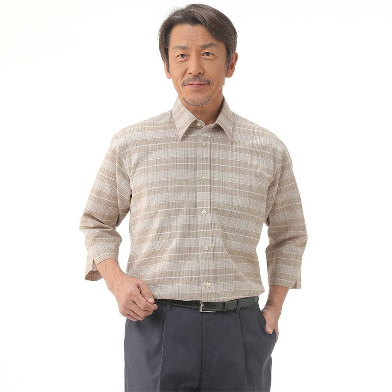 風合い豊かなしじら織り素材を使用した、上品なチェック柄の7分袖シャツです。