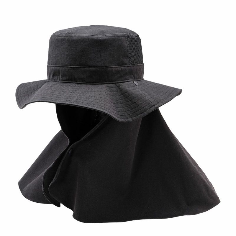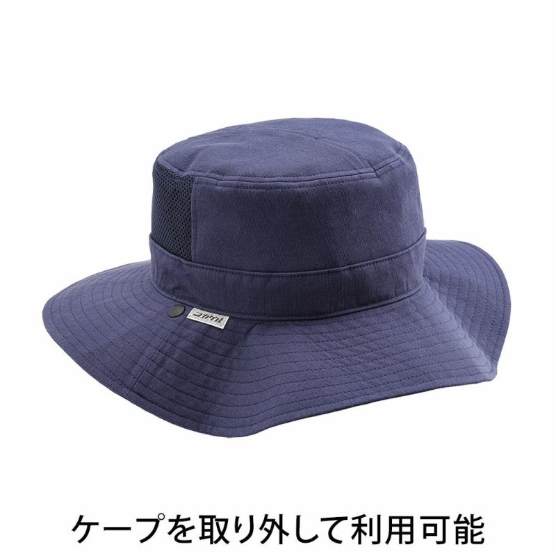 直射日光を跳ね返す遮熱帽子コカゲルのアドベンチャーハット。取り外し可能なロングケープ付きです。