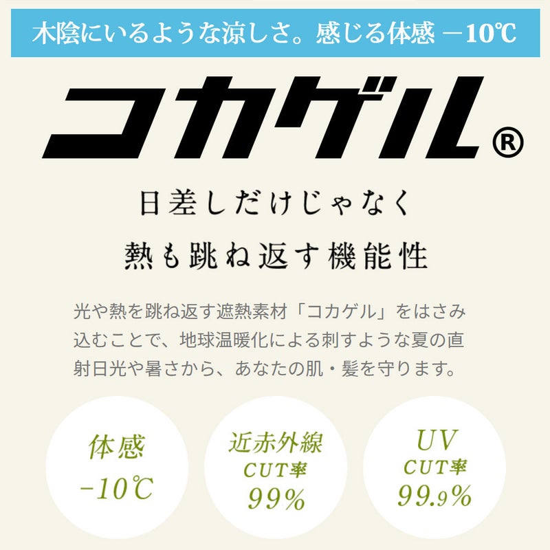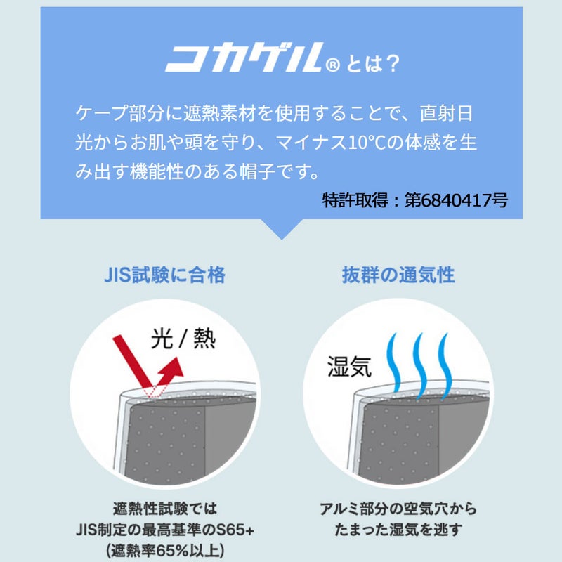 帽子内部には、遮熱素材「コカゲル」を挟み込んだ特殊構造を採用。