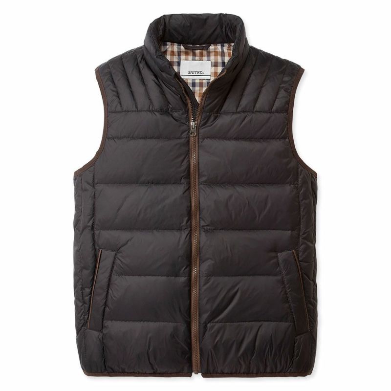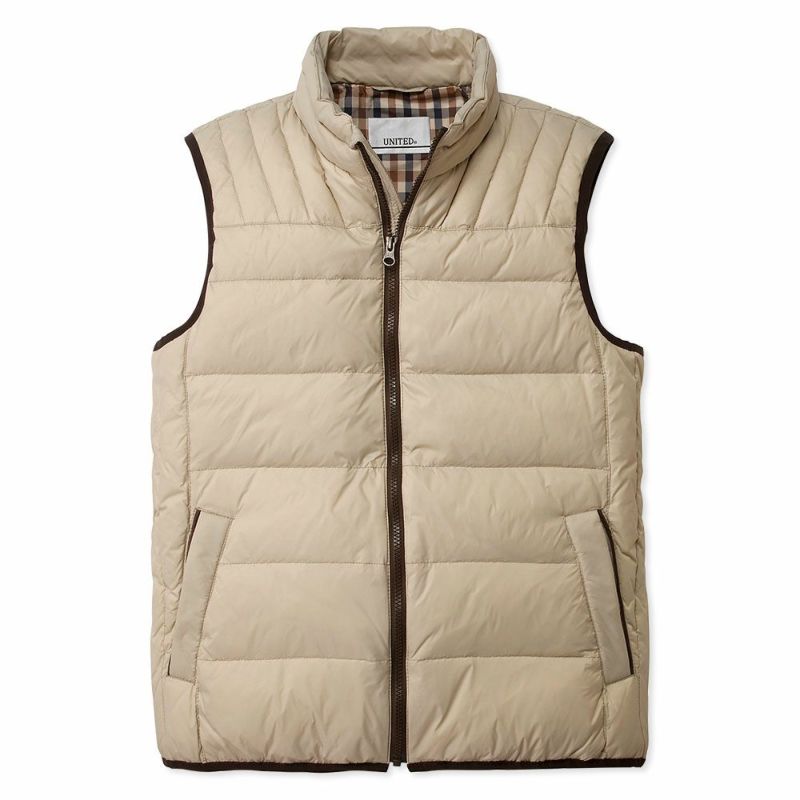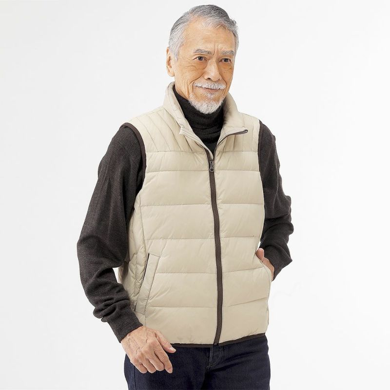 フィルパワー700の高品質ダウンを使用した、軽くてふっくら暖かなダウンベスト。配色のパイピングがアクセント。