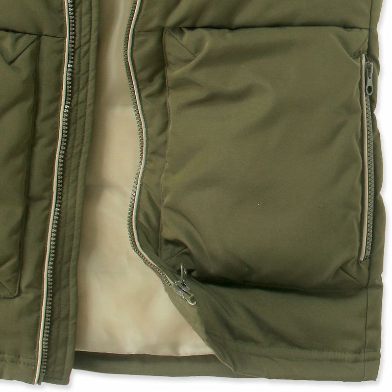 素材:表地/裏地/別布/中わた(襟/内前たて/内胸ポケット玉ぶち)=ポリエステル100%、充填物(前後身頃/腰ポケット)=ダウン90%+フェザー10%
