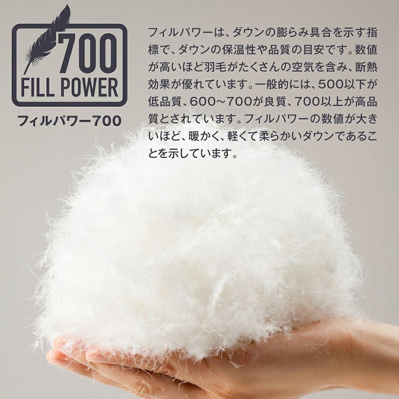 フィルパワーとはダウンのふくらみの大きさを示す数値で、一般的に700以上であれば高品質と言われています。