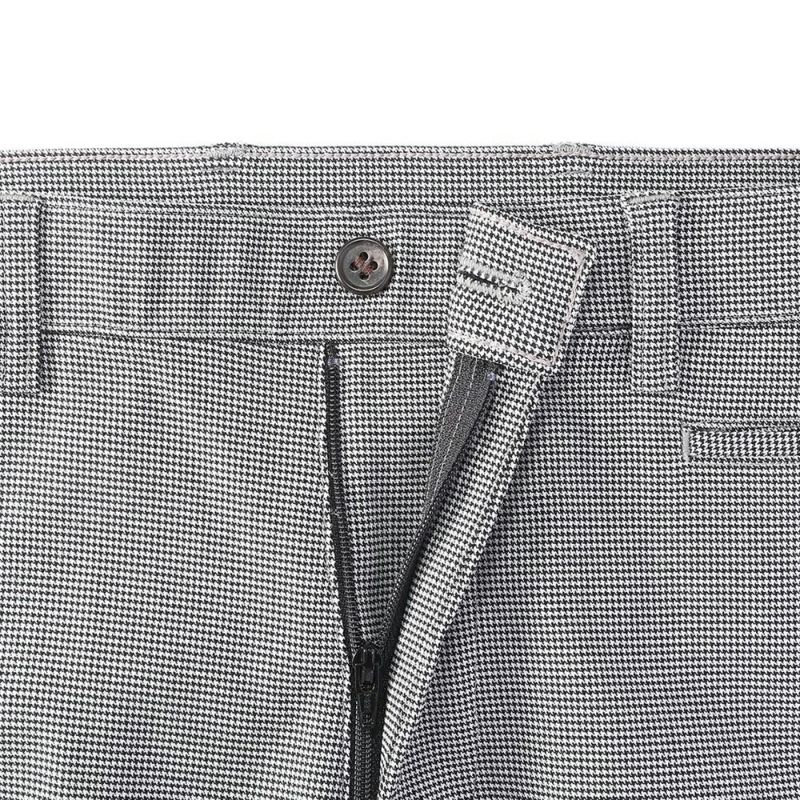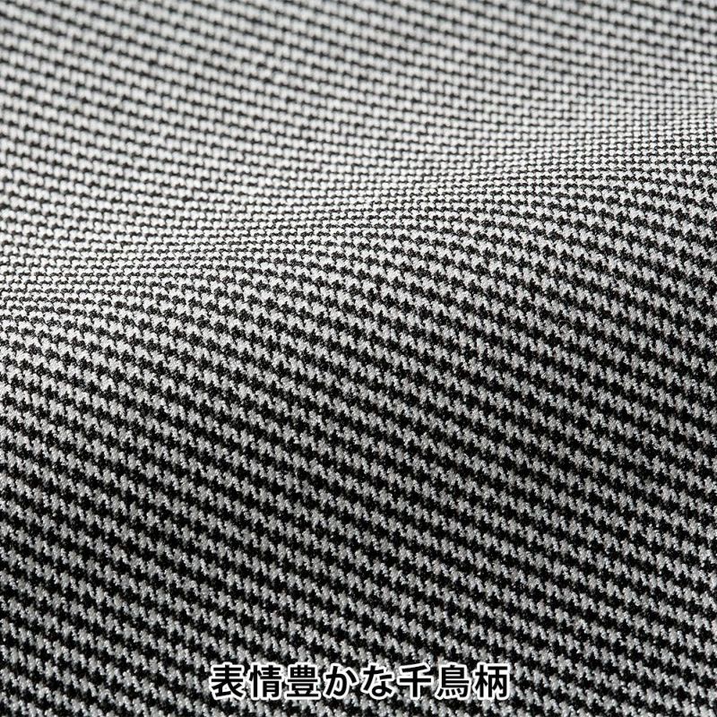 素材:本体(千鳥)=ポリエステル40%+レーヨン39%+ナイロン16%+ポリウレタン5%、本体(ネイビー)=レーヨン42%+ナイロン29%+ポリエステル24%+ポリウレタン5%、別布部分=ポリエステル65%+綿35%