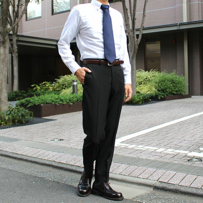 ビジネスシーンに大活躍の無地ノータックスラックス。スタイリッシュでスリムなシルエットです。