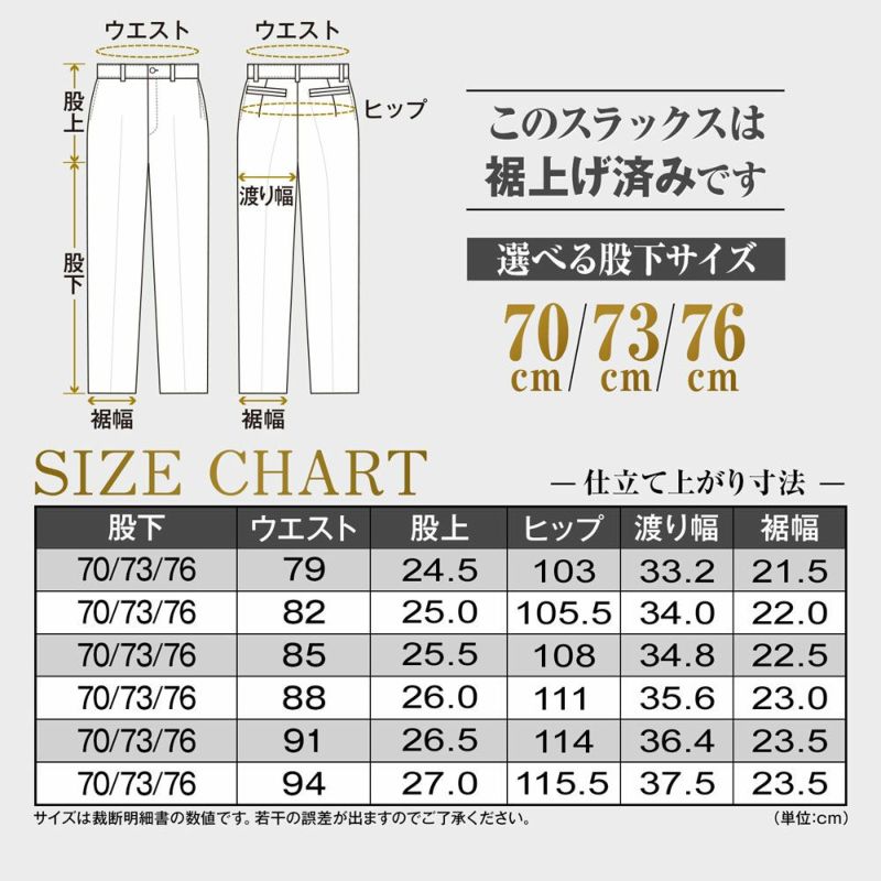 裾上げ済みなので、届いたらすぐ履けます。ご家庭の洗濯機で洗えるウォッシャブル仕様で、洗濯後でも折り目、センタープレスがとれにくく、シワになりにくい素材なので、アイロン不要。旅行・出張などにも便利です。