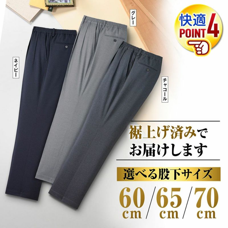 裾上げ済みで届いたらすぐにご着用いただけるツータックスラックス。股下サイズは60cm、65cm、70cmからお選び下さい。