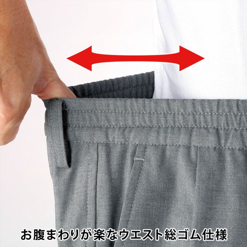 らくらく快適なウエスト総ゴム仕様。ベルトループが付いていますので、ベルトを締めればゴム部分がかくれ、お洒落に着用できます。