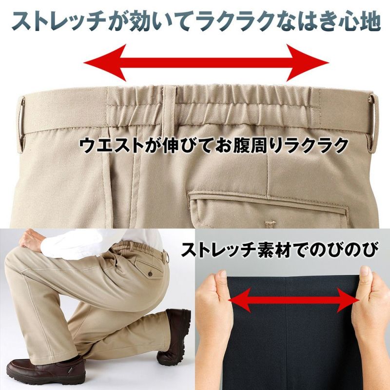 ウエストらくらく快適な脇ゴム仕様のノータックスラックス。裾上げ済みなので届いたらすぐにご着用いただけます。