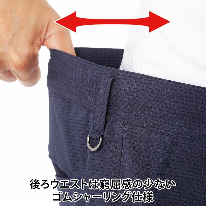 タテ・ヨコ・ナナメ、どの方向にも伸縮する高ストレッチ素材で、さらに後ろウエストシャーリング仕様でゴルフなどアクティブな動きにも難なく対応します。