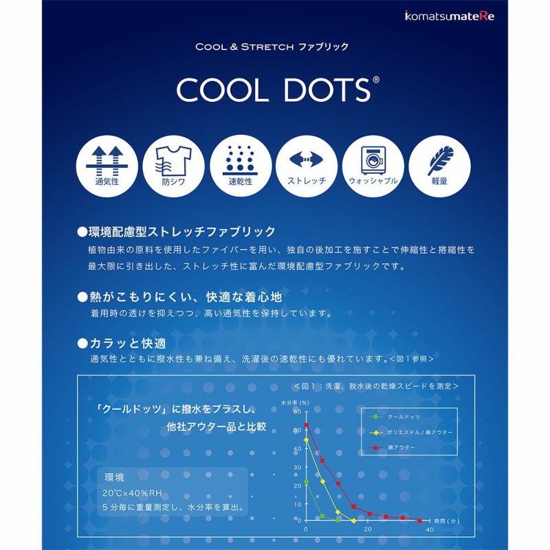 特殊な技術で微細な穴を無数に開けたポリエステル素材「クールドッツ」を使用。空気を通すので熱がこもりにくく、さらに接触冷感・UVケア加工も施されています。