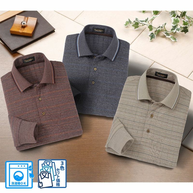 ジャカード編み素材の長袖ポロシャツ3色組。