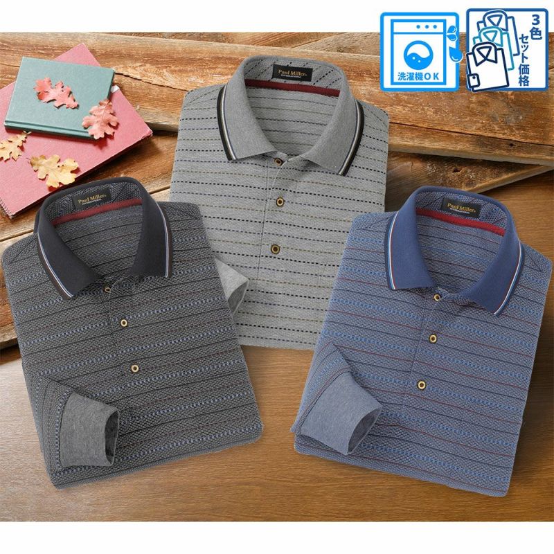 先染めならではの上品な色合いの長袖ポロシャツ。ブラック、グレー、ネイビーの3色組です。