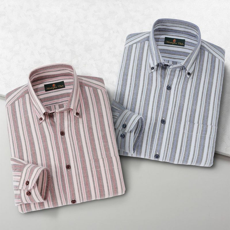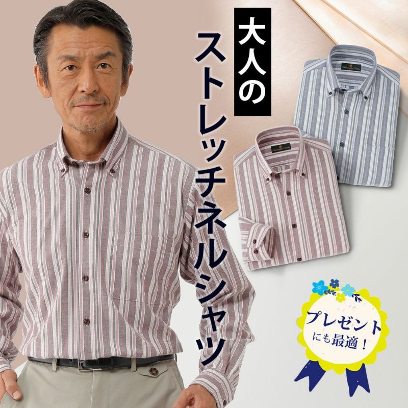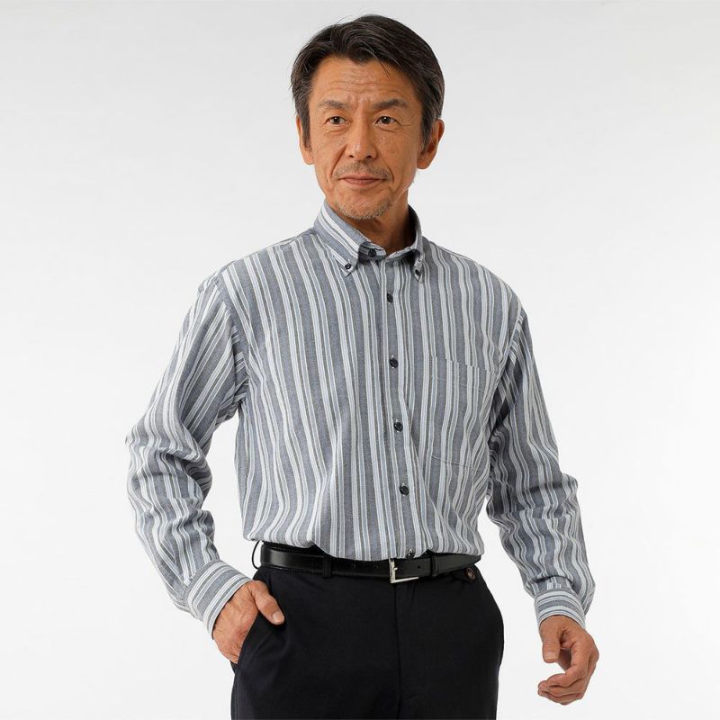 柔らかな風合いで落ち着いた色柄のネル素材の長袖ボタンダウンシャツ。