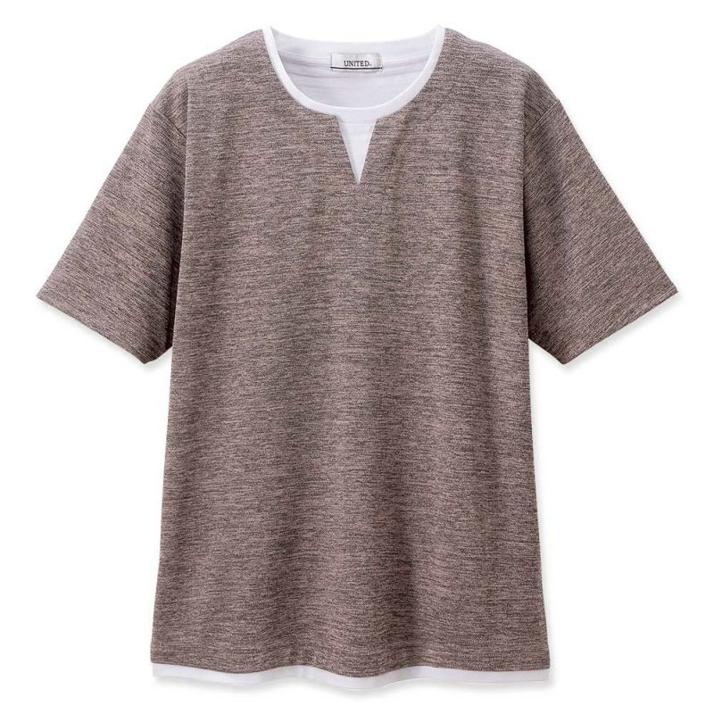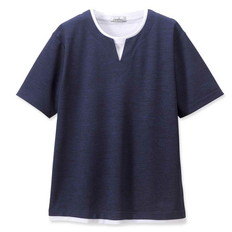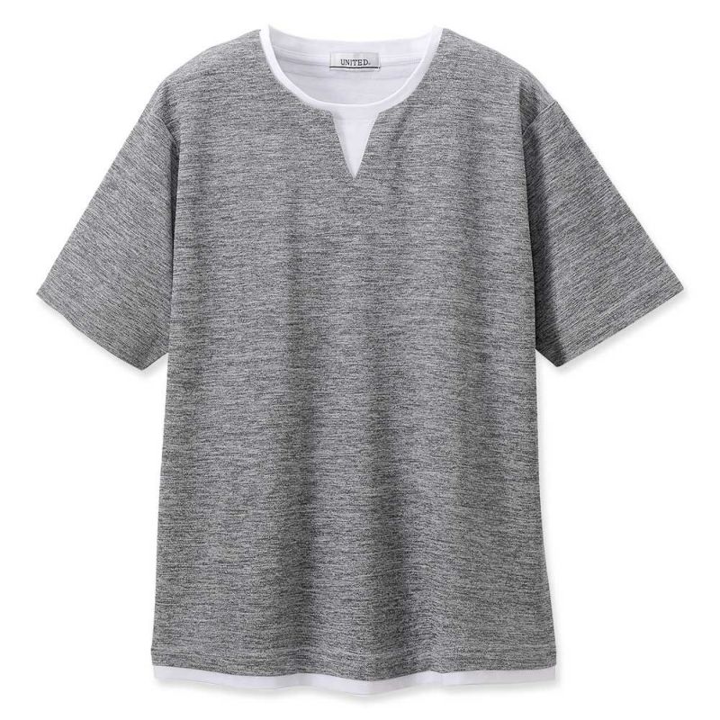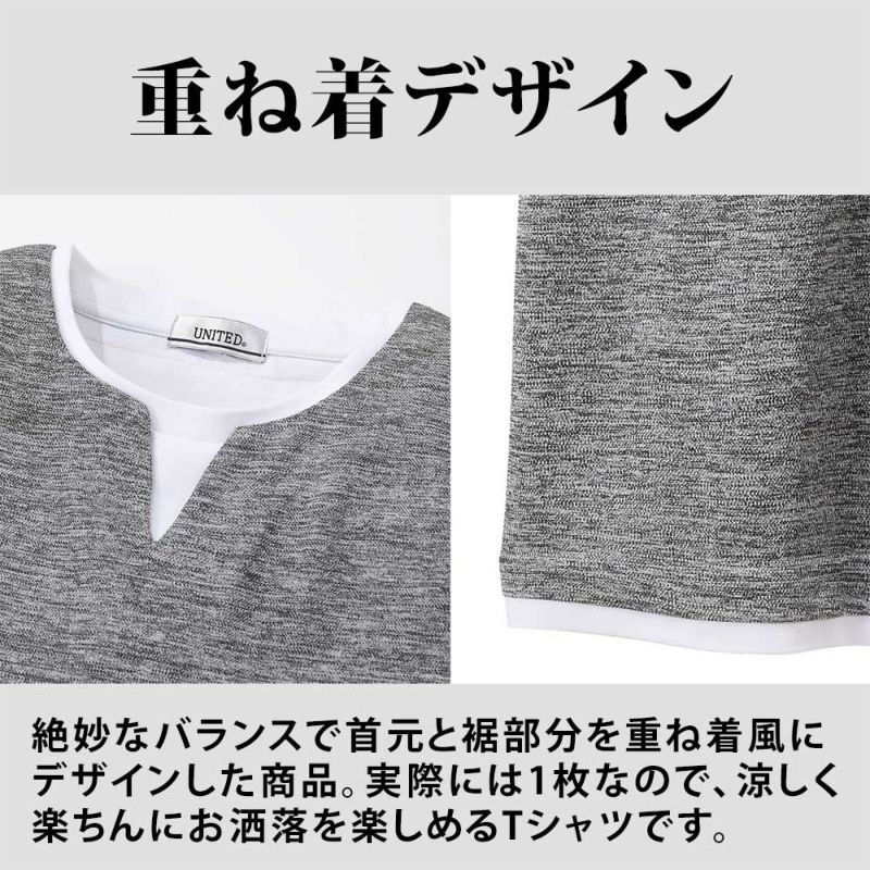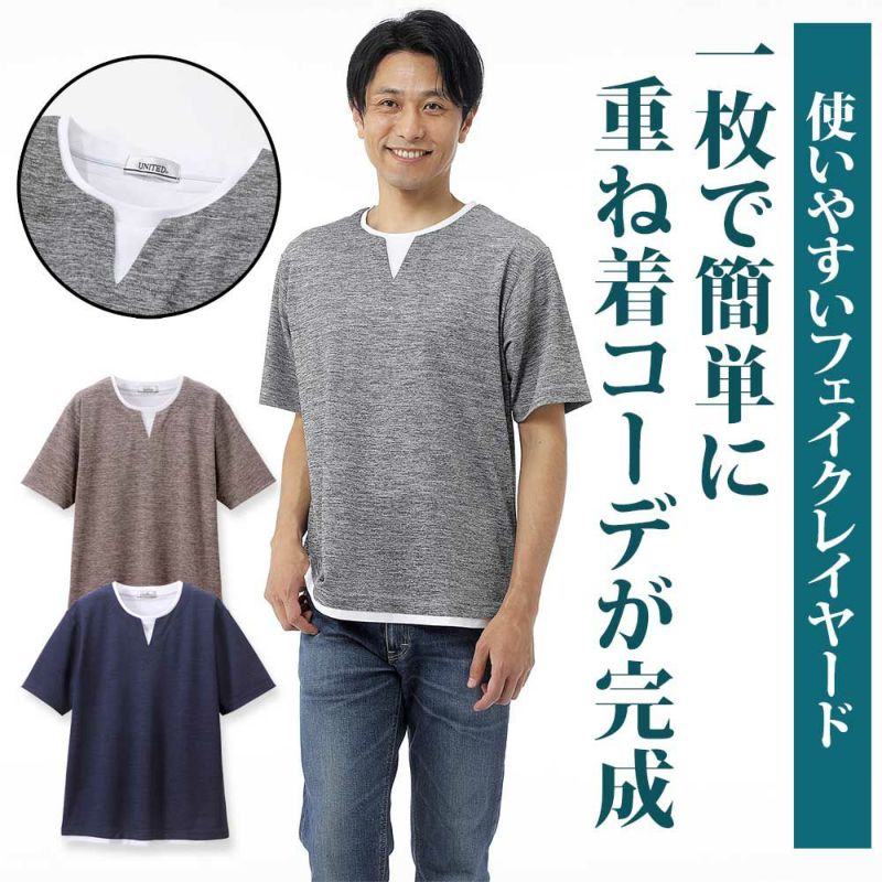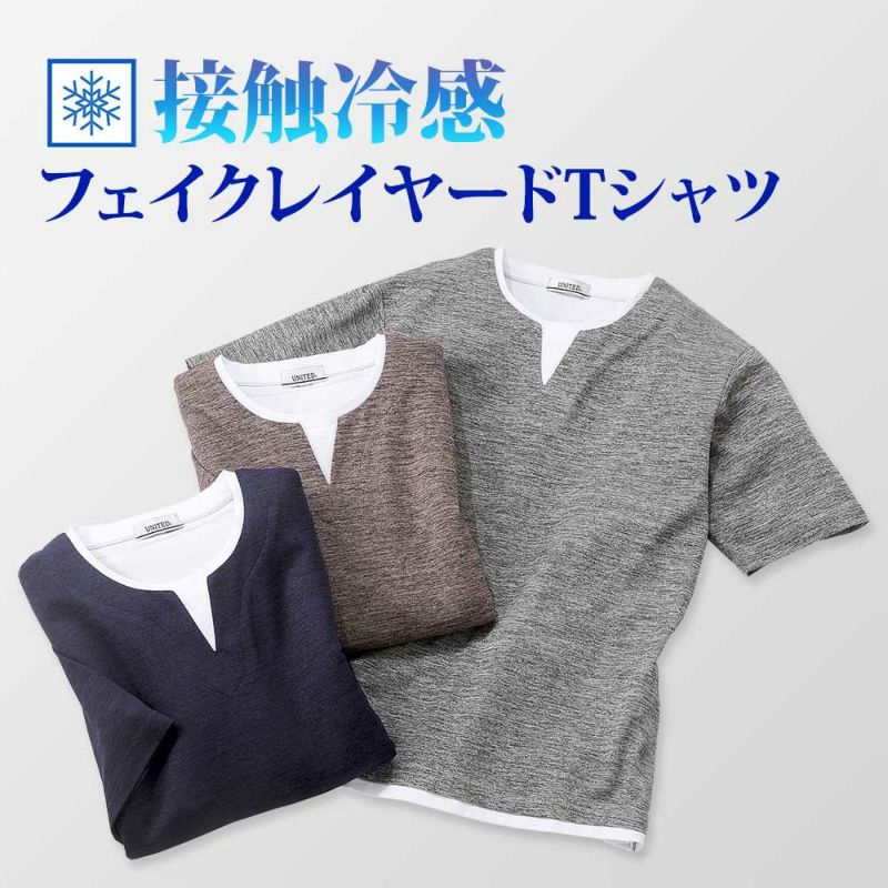 一枚で簡単に重ね着風のコーディネートができるフェイクレイヤードTシャツ。接触冷感の機能付きです。