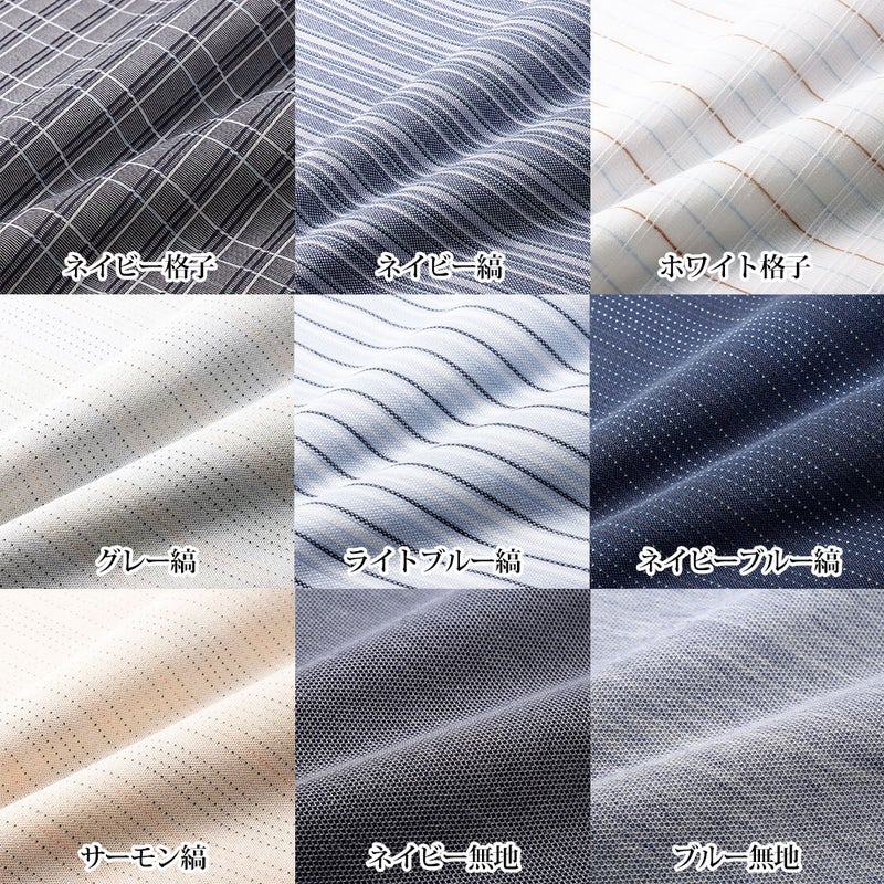 グレー縞/サーモン縞/ネイビーブルー縞:本体部分=ポリエステル65%+綿35%、衿部分=ポリエステル65%+綿35%