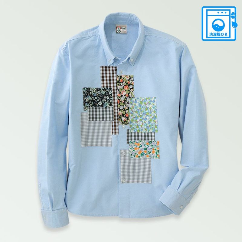 上品なオックスフォード仕立てに、フラワーとチェックのパッチワークをアシンメトリーに施しました。