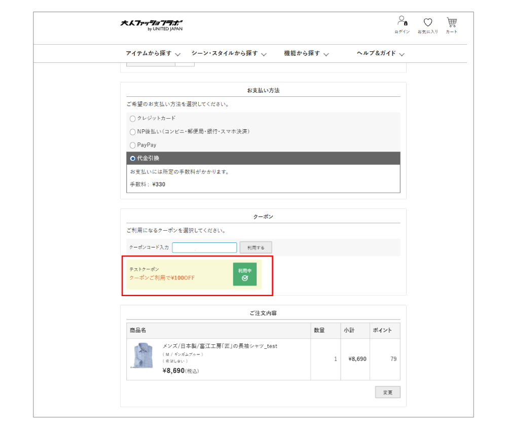 3.ご注文手続き画面にて、利用可能なクーポンが表示されます